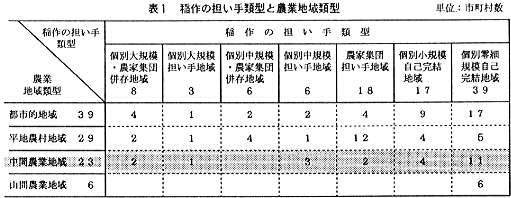 @農業地域類型と稲作の担い手類型の関係 農業地域類型と稲作の担い手類型をクロス分析すると、以下のとおりであった。 山間地地域は全て零細規模自己完結地域である。平地農村地域では、農家集団担い手地域及び個別大規模・個別中規模と農家集団の併存地域等、農家集団の比重の高い地域が多い。都市的地域、中間農業地域では、担い手類型との一定の傾向はみられない(表1)。