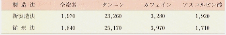 表1 新製法と従来法によるインスタント緑茶の化学成分含量(mg/100g可溶分)