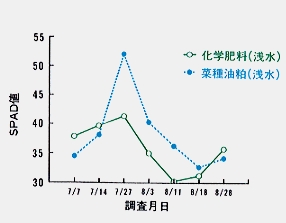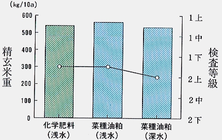 3)水管理は、移植後から中干し時期まで1〜2pの浅水で管理すると、菜種油粕の分解に伴う土壌の 還元化が改善され、慣行(全量化学肥料)とほぼ同等の水稲の収量、品質、食味が得られます。