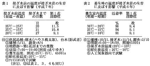 @接ぎ木前及び接ぎ木−養生−順化後の温度は、昼温25℃、夜温15℃(以下25℃−15℃)で管理すると、20℃−10℃管理よりも接ぎ木までの日数は短かくて、接ぎ木苗の活着率が向上し、第1花房着生位置は高温管理よりやや低い11節程度となる(表1、4、一部データ略)。
