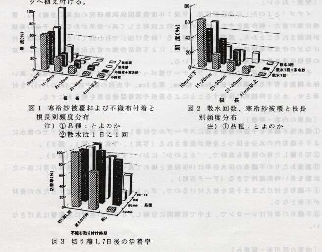 @吸水性不織布を子苗の発根基部にステープルで付着し、散水や寒冷紗被覆下での散水により不織布内の水分を保つと発根が促進される(写真1、写真2、図1、図2)。