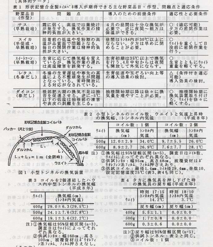 @形状記憶合金製コイルバネによる自動換気装置が適応できる野菜品目・作型としては、ナス、スイカ等果菜類やスイートコーンの早熟栽培、ダイコンの春だし栽培等が考えられる(表1)。