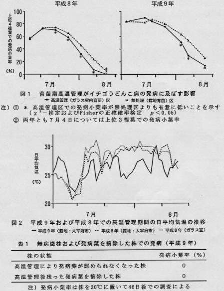 - 1 低温暗黒処理開始まで40日間前後イチゴの苗を施設内で高温管理することにより育苗期でのうどんこ病の発病が抑制され、露地育苗よりも早く終息する(図1左)。また、高温管理により発病葉が認められなくなった株では発病適温(20℃)下に置いても発病が認められない(表1)。したがって、感染源となる発病葉の本圃への持ち込みを高温管理により軽減し、本圃での発病を抑制できる。
