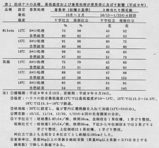 - 1 9月下旬定植の促成栽培で、10月から2月までの最低温度を12℃、15℃、18℃に設定したハウス内で自然結実した「Mi1eda」は、いずれの温度においてもホルモン処理を行った「筑陽」と比べて同等以上の着乗率を示す(表1)。