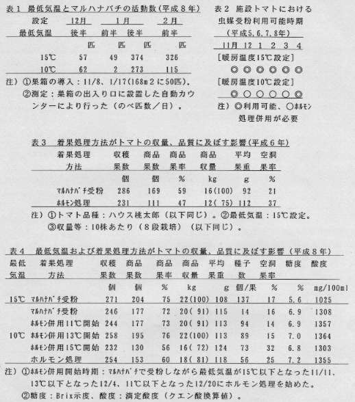 [要約]施設トマトでは、最低気温を15℃に設定すればマルハナバチを利用して受粉するだけでもホルモン処理を行った場合と同等以上の商品収量が得られる。慣行の最低気温10℃設定で栽培する場合は、マルハナバチを利用しながら最低気温が13℃以下になる時期からホルモン処理を併用すると、ホルモン処理のみを行った場合より空洞果の発生が減少し商品収量が多くなる。