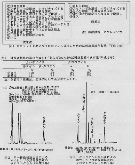 - 1 ホウレンソウでは、アセトン抽出液を試料調製液としてHPLCへ注入する方法は、従来の精製を伴う方法よりも簡易に試料の調製ができる。この方法では、カロテノイドおよびクロロフィルの試料調製液中合育量が従来法より高くなる(図1、表1)。