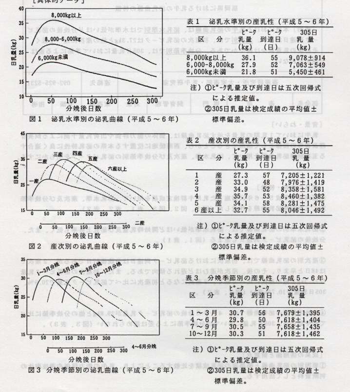 @福岡県で平成5〜6年に実施した乳用牛群検定成績を用いて、泌乳水準、産次及び分娩季節別に五次回帰泌乳曲線を作成した(図1、図2、図3、表1、表2、表3)。