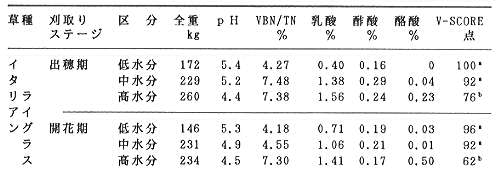 A刈取りステージによる発酵品質の差はほとんどないが、飼料価値の点から、できるだけイタリアンライグラスは出穂期に、スーダングラスは伸長期に調製した方が栄養価が高い。