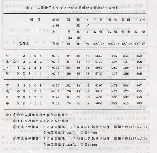 1.3〜1.4t/10a、TDN収量が 0.84〜0.96t/10aと高い優良品種である。