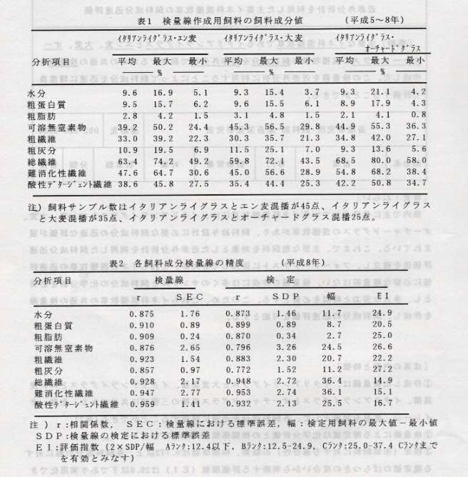 @作成した検量線は、イタリアンライグラスと大麦混播、イタリアンライグラスとエン麦混播、イタリアンライグラスとオーチャードグラス混播の三種類に共通であり、生草、サイレージ、乾草を対象として、各飼料成分を迅速に評価することができる(表1)。