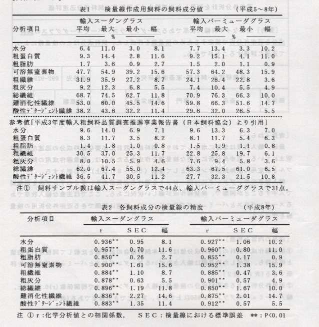 @検量線作成用飼料の各飼料成分値は、日本飼料協会の公表値と比較して同程度の平均値と幅を持ち、作成した検量線は輸入されているスーダングラスとバーミューダグラスを評価できる(表1、表2)。