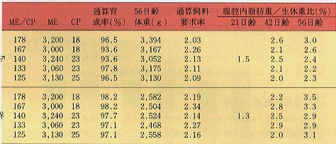 3)体脂肪の蓄積は、飼料の代謝エネルギー(ME)と蛋白質含量(CP)の比に影響を受けます。体脂肪の蓄積は、24日から26日齢以降急激に進む傾向にあります。そのため22日齢以降の飼料組成を代謝エネルギーは、3,150kcal/s、蛋白質含量は22.8%(ME/CP=138)にすることにより、腹腔内脂肪率2.7%、体脂肪率13.4%程度の低脂肪ブロイラー生産が可能となります。