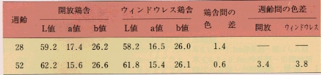 表1 各週齢時及び鶏舎構造の違いによる卵殻色と色差