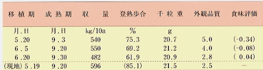 2)移植期は6月5日前後が適期です。5月20日移植では外観品質がやや低下します。6月20日移植では登熟歩合が低下するため減収します。