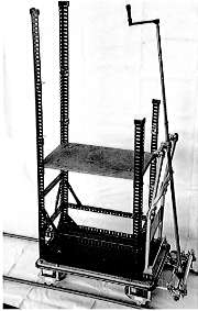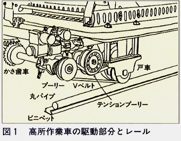 1)開発した高所作業車は簡易に製作できます。既製の台車にレール走行用の戸車、プーリー、Vベ ルト、回転軸及び高さ調節ができる手動ハンドルを取り付け、人が乗る作業台は踏み板の高さを任 意に設定できるようにラック用部品を取り付けています。