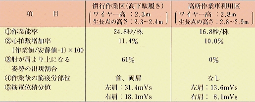 3)高所作業車利用により、作業時間は、慣行の高下駄履き作業に比べ32%短縮でき、心拍数増加 率は1.4%低下します(5%レベルで有意差あり)。また、作業姿勢の改菩とともに首や肩の痛みが 解消され、節電位から見た肩の筋負担は左右ともに57%程度軽減できます。