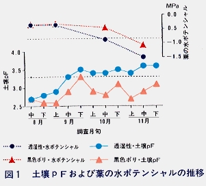 1)被覆資材に白色透湿性シートを用いると、黒色ポリエチレンフィルムを用いた場合より、土壌が乾燥し、樹が水分ストレス状態になります。