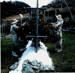 2)透湿性シートは太陽の光を散乱するため、果実への光の供給が多くなり、果実の色つきが早くなります。また、樹の下に敷いたシートからの散乱光で、樹冠の内部まで光が入り、樹全体の着色も揃 います。