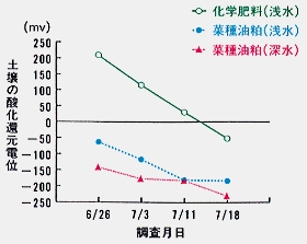 3)水管理は、移植後から中干し時期まで1〜2pの浅水で管理すると、菜種油粕の分解に伴う土壌の 還元化が改善され、慣行(全量化学肥料)とほぼ同等の水稲の収量、品質、食味が得られます。