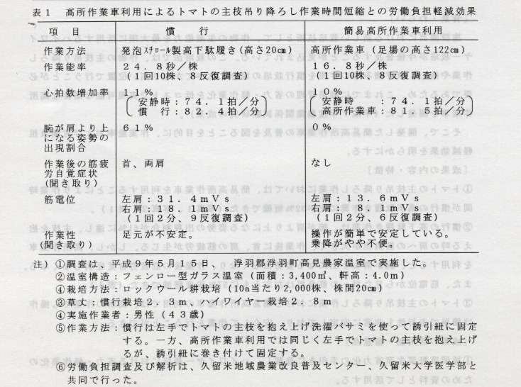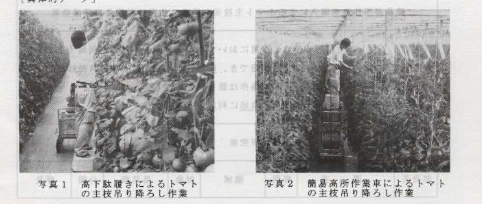@トマトの主枝吊り降ろし作業においては、簡易高所作業車を利用することにより作業時間が慣行の高下駄履き作業に比べ32%短縮できた(写真1、写真2、表1)。