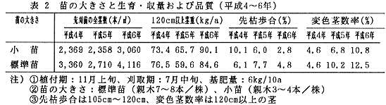 A植付苗を小苗(親木3〜4本/株)にすると先刈前の全茎数は標準苗(親木7〜8本/株)に比べ70〜90%になり、平成4年を除いて先刈後の生育促進により収量が多く先枯れや変色茎がやや少なくなる傾向がみられる(表2)。