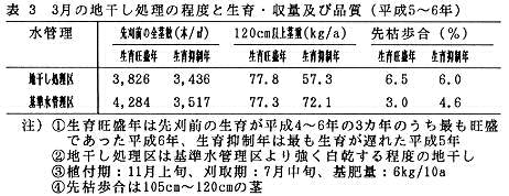 B3月に土壌表面が白乾する強い地干し処理を行うと、生育過剰年では基準水管理に比べ先刈前までの生育抑制が認められるが、生育抑制年では認められない。いずれの年でも収量の増加はなく先枯れが多くなる(表3)。