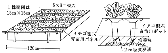 A簡易水槽は、板及びビニル製の水槽(幅120p、高さ20p)で、これにイチゴ棚式育苗用パネルと育苗小型ポットを組み合せることで、15p間隔にサラダナを栽培できる(図1)。