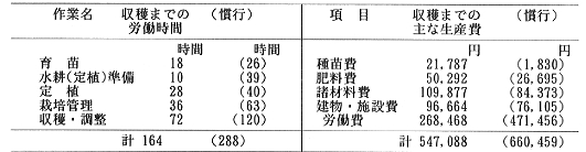 表1 10a,1作当たりの収穫までの労働時間及び主な生産費