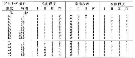 @葉ワサビ酒粕漬けの加工において、変色を防止しワサビの風味を保持する最適ブランチング条件は、60℃、2〜4分であり、これを4℃で冷蔵すると3週間は品質が低下しない。なお、60℃でブランチング時間が短くなると辛味の発現が少なく、70℃以上ではブランチング時間の長短に関係なく、褐変しやすく、辛味も低下する(表1)。