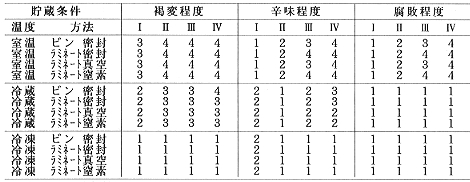 A密封包装の形態にかかわらず、冷凍貯蔵によって品質の保持が可能である(表2)。しかも、冷凍後1年を経過しても品質の低下は認められない。