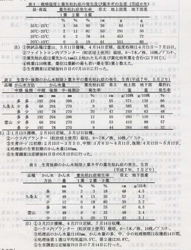 200mm程度の多かん水管理を行った場合、葉先枯れ症の発生は「九条太」、「雷山」とも約10%である。生育中期にかん水制限を行った場合の葉先枯れ症の発生は、両品種とも多かん水管理と同程度である。しかし、生育後期にかん水制限を行った場合は、「雷山」では発生は多かん水管理と同程度であるが、「九条太」では多かん水管理に比べ約2倍に増加する(表2)。