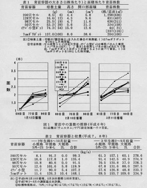- 3 105日苗を定植する場合、7pポリポット苗の収量が最も多いが、50穴、200穴、128穴セル成型トレイ苗定植もこれに次いで多い。セル成型トレイ苗では7pポリポット苗に比べて2、3年生株の2L規格収量が少なく、2年生株のS,M,L規格もやや少ない。7pポリポットを除き、収量と培養土量との間に一定の傾向は見られない(表2)。