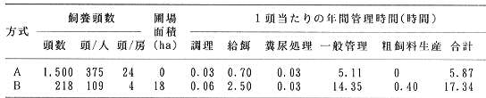 @1人当たり飼養頭数は大規模経営のA方式では約375頭と多いが、細断済の流通粗飼の活用やによる調理・給餌作業の省力化等を図ることによって、1頭当たりの年間管理時間を中規模経営のB方式に比べて約1/3程度にすることができる(表1、2)。