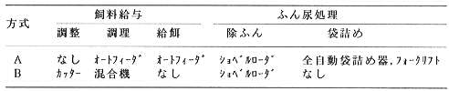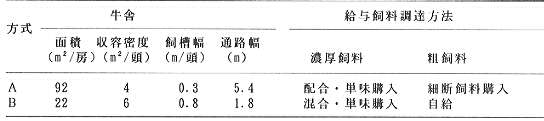 AA方式の牛舎は、等の作業性を良くするために通路幅は5.4mと広い。また、1頭当たりの餌槽幅が狭く、収容密度はB方式に比べて1.5倍と高いことから、給餌回数を増して競合に弱い牛の採食不足を補っている。(表1、2)。