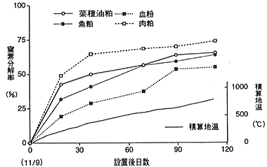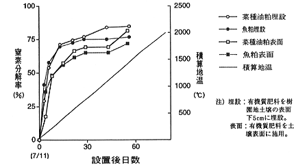 夏期の菜種油粕、魚粕の窒素の分解は施用直後から急速に進行し、埋設14日後でともに70%、2カ月後で78〜85%である。冬期の分解は緩やかで埋設20日で30〜50%、3カ月後で50〜70%である。また、表面施用は土中埋設に比べ窒素の分解が遅くなる。