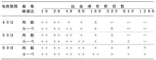 Bルーペや顕微鏡を利用すれば、抗血清濃度が低くても判定が可能である(表1)。